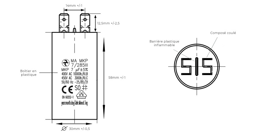 Signification des mentions indiquées sur les condensateurs moteurs :