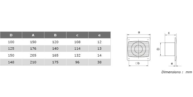 Côtes et dimensions du ventilateur pour ventilation et extraction d'air